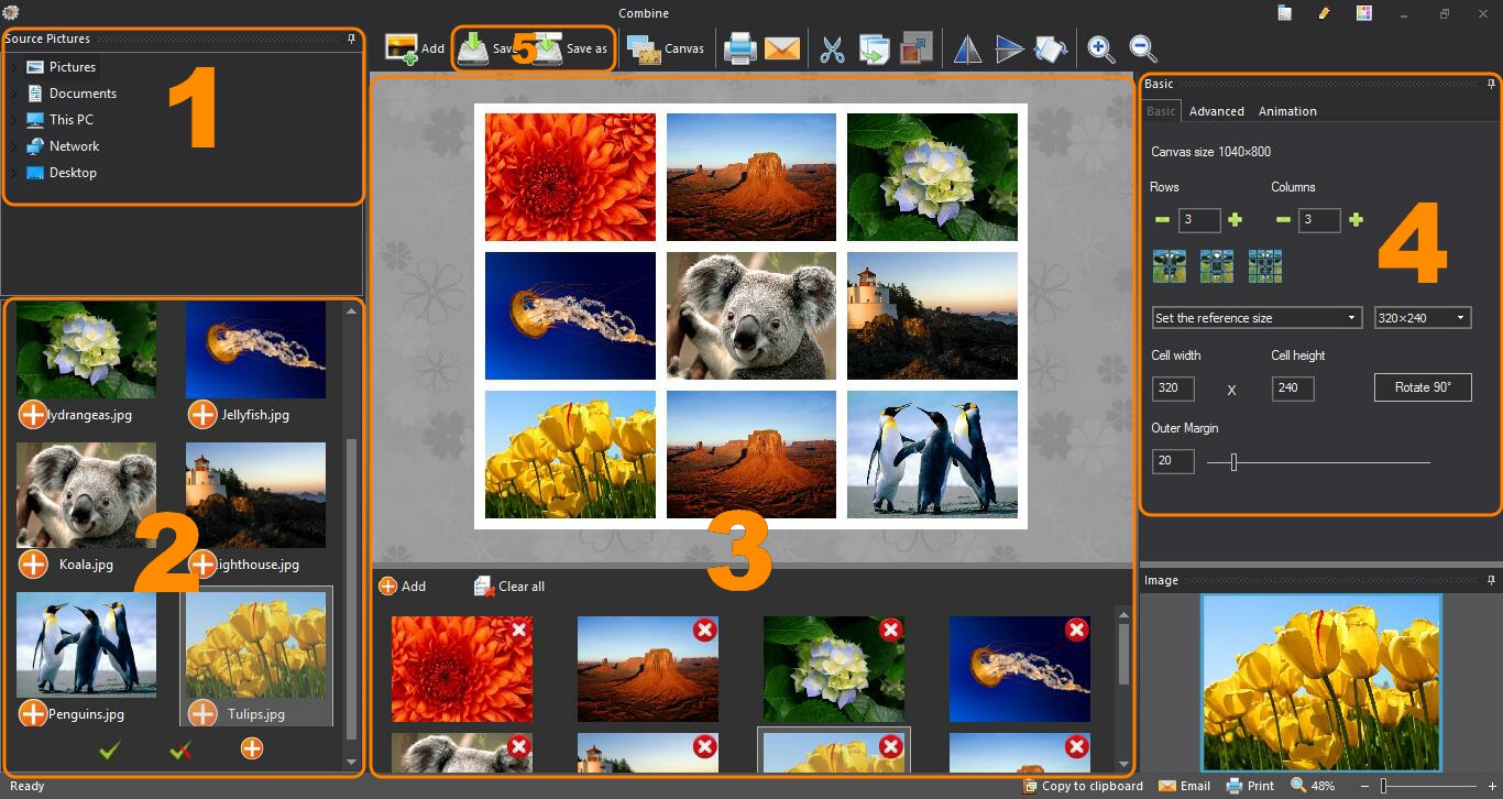 Step:1.choose folder  2.choose pictures  3.review the combined picture  4.set  5.save/save as