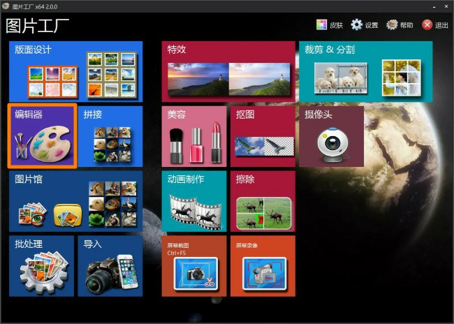 图片工厂是集图片浏览,编辑,排版,相框和美容特效等一体的软件,并提供大量的素材资源。