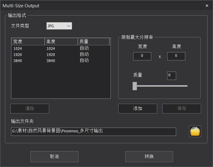 点击多尺寸输出按钮弹出多尺寸输出窗口,可以多种尺寸的图片