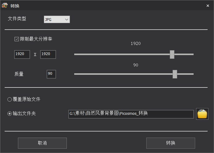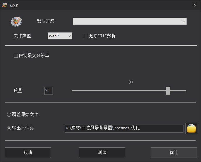 点击优化按钮弹出优化窗口,可以将您的图片转换成需要的类型、分辨率和质量